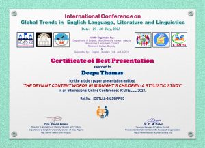 • “A Stylistic Study of the Language Play in the Select Novels of Salman Rushdie” in the Proceedings of the Centenary International Conference on Advancements in Science & Humanities (CICASH 2019) organized by the Finishing School Committee, St. Thomas College, Thrissur from March 21-23, 2019. Pages 17-27. ISBN No: 978-81-935819-5-7