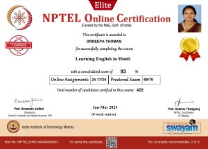 Awarded First rank with gold medal in the SWAYAM NPTEL online certification course titled “Learning English in Hindi”,attended as part of the Faculty Development Programme,  with a consolidated score of 93% in the January 2024 semester